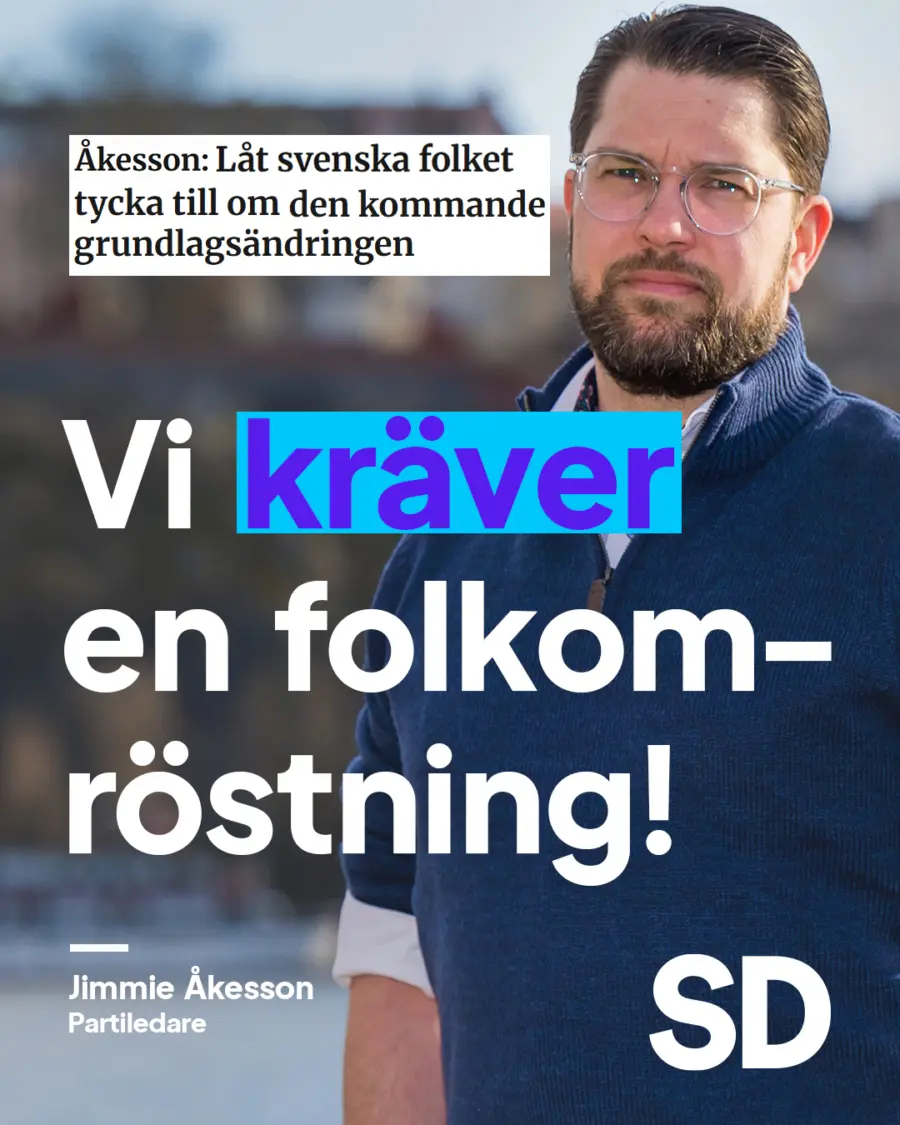 Idag presenterar Sverigedemokraterna ett initiativ för att låta svenska folket tycka till om den kommande ändringen av grundlagen. Partiet kommer att lämna in en formell begäran om folkomröstning till riksdagen.