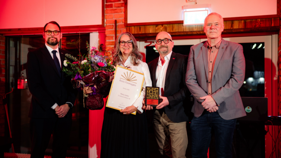 Magnus N:son Engelbäck, Regionchef Företagarna Syd, Maria Jarbo, VD/ägare, Cocandy Konfektyr AB, Årets Företagare 2025, Dick Sjöland, ordförande Företagarna Åstorp och Peter Lindberg, kommunstyrelsen ordförande, Åstorps kommun Fotograf: Aatig Media AB
