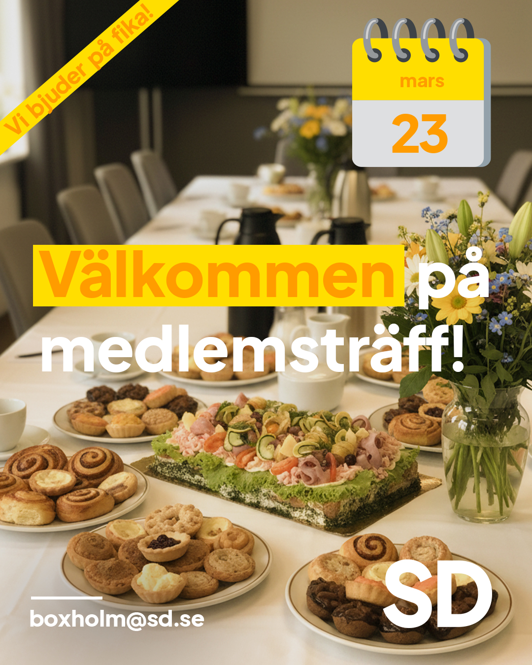 Du är varmt välkommen till en medlemsträff med SD Boxholm.