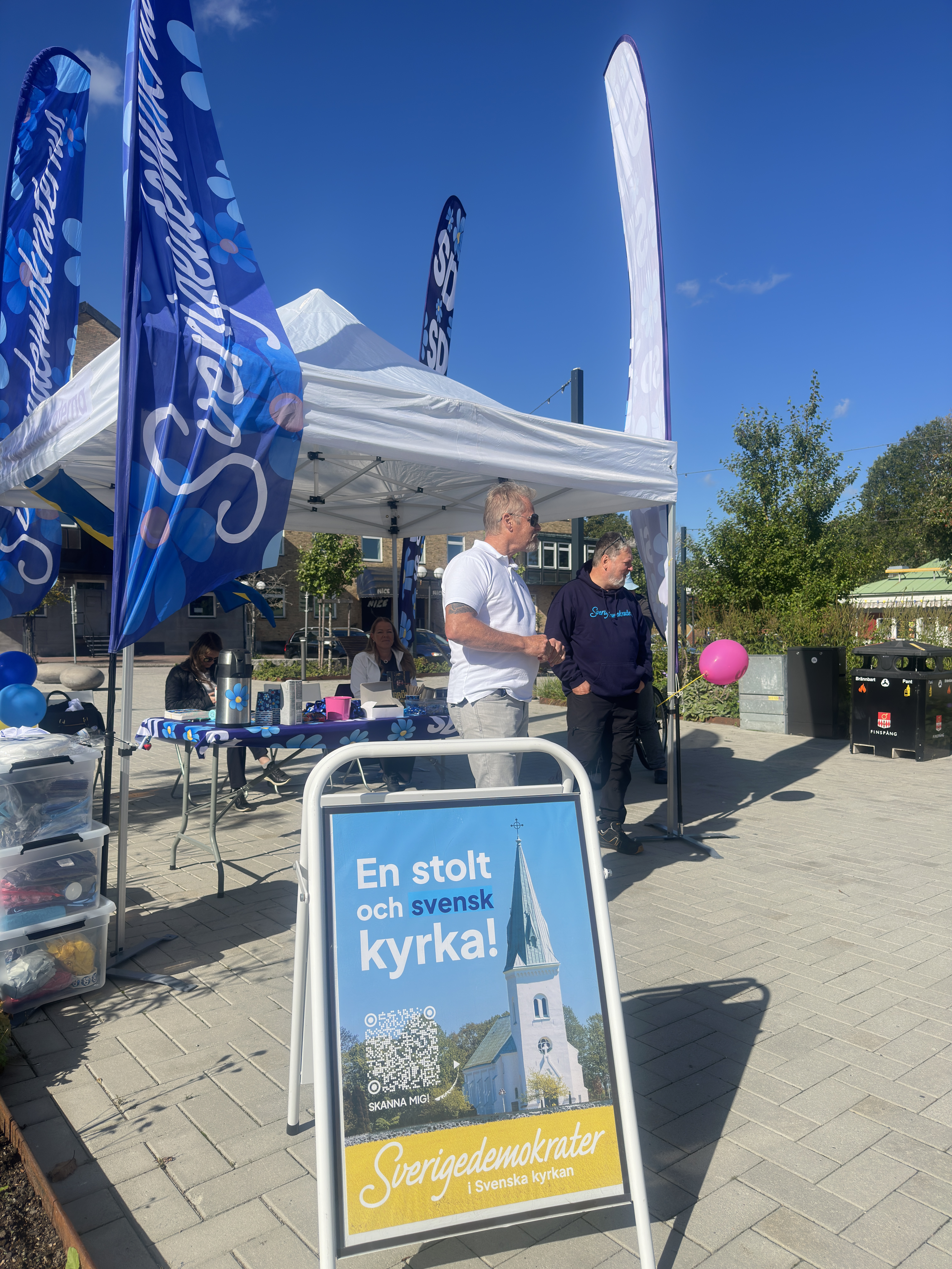 Vårt mål var enkelt: att möta finspångsborna inför kyrkovalet, berätta om vår politik och prata om framtiden för Svenska kyrkan. Stämningen var varm och engagerad – vi delade ut flygblad, förklarade hur man röstar, pratade öppet om kyrkans roll, våra traditioner och värderingar, och bjöd på fika medan vi svarade på frågor direkt vid tältet.