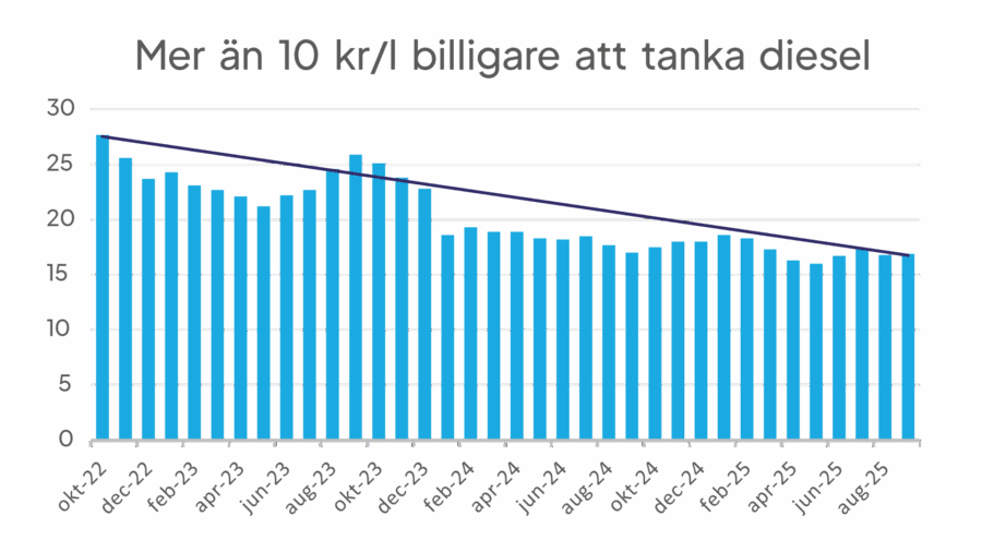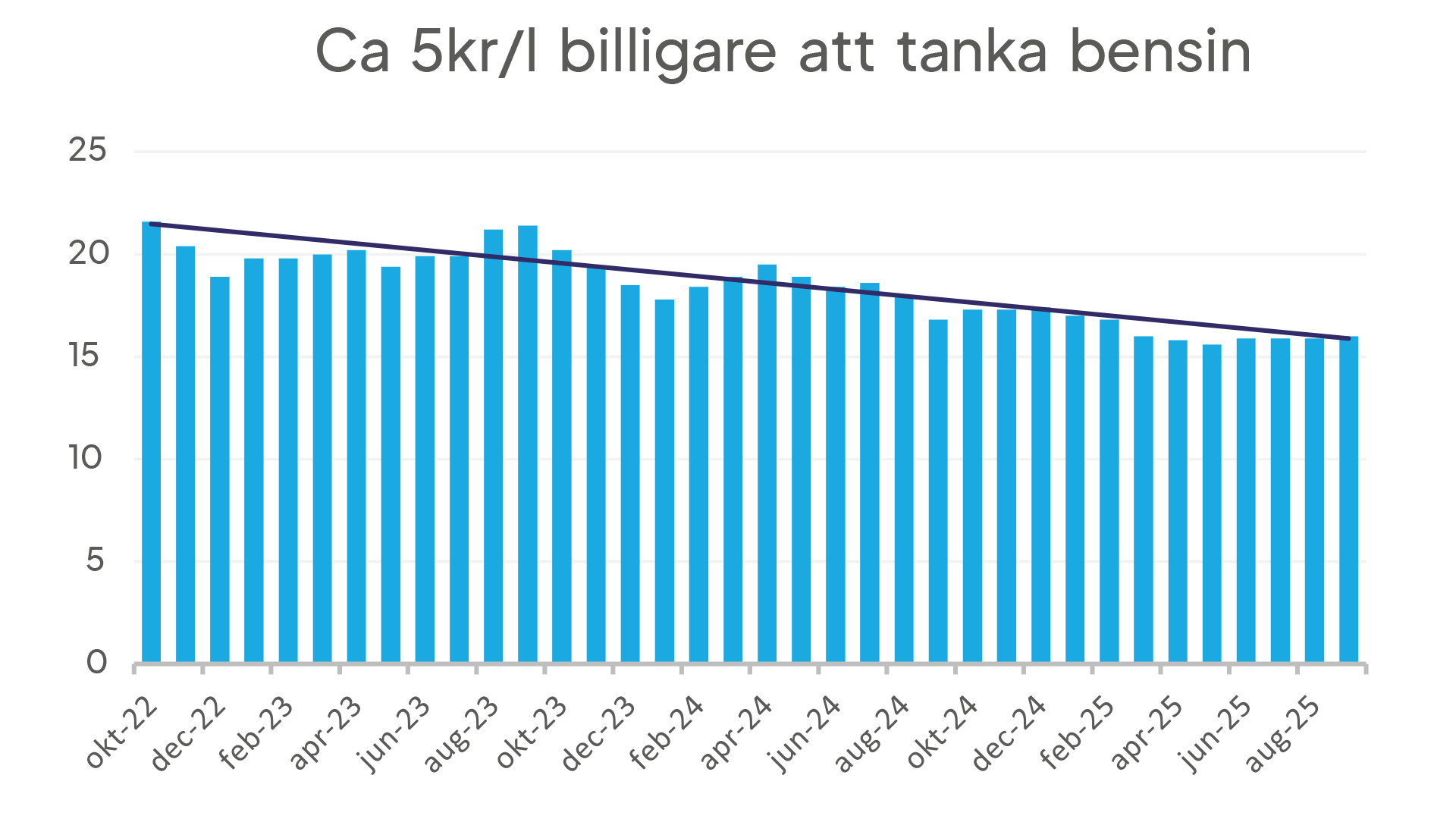 Skatten på bensin och diesel har sänkts i varje budget hittills under mandatperioden. Dessutom sänktes reduktionsplikten rejält den 1 januari 2024. Om den tidigare S-regeringens bana hade legat kvar hade inblandningen av biodrivmedel i diesel 2025 varit 45%. Nu kommer reduktionsplikten istället att vara 10% och ligga kvar på den nivån under överskådlig framtid. När den här regeringen tillträdde med vårt stöd kostade dieseln nästan 28 kr/l, nu kostar den ca 16 kr/l. Skatten på diesel ligger nu på EU:s miniminivå.