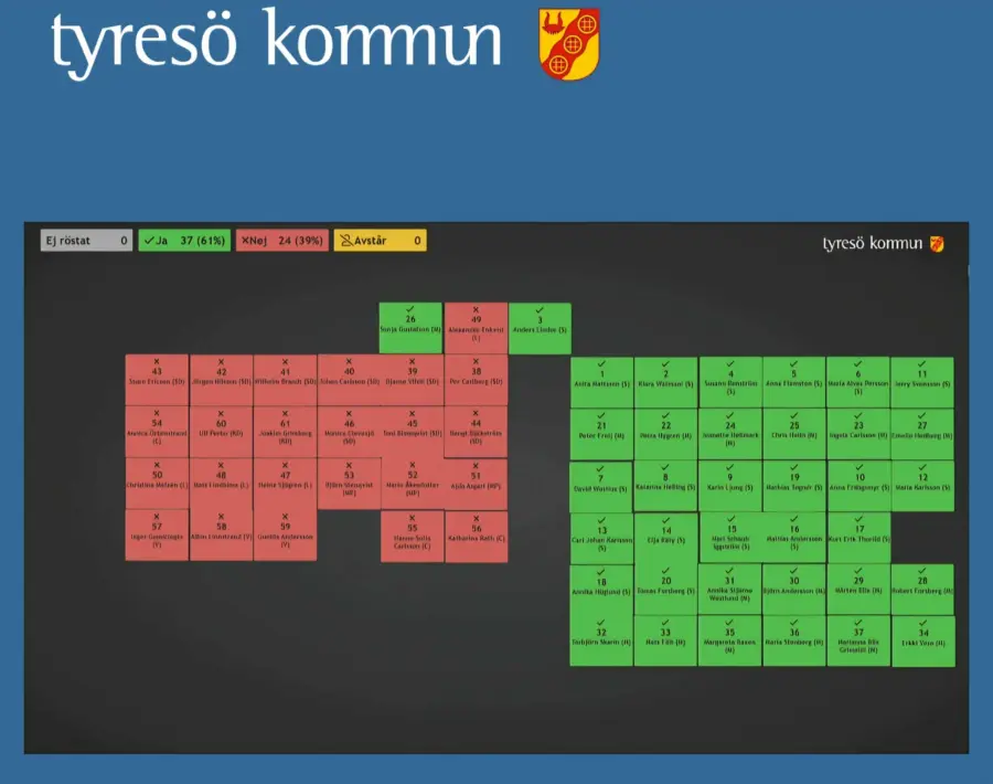 Sen hade vi några punkter om valdistriktsindelning inför valet 2026, delårsrapporter, meddelanden och nedläggning av SMOHF (Södertörns Miljö- och hälsoskyddsförbund. Men efter det blev det spännande.