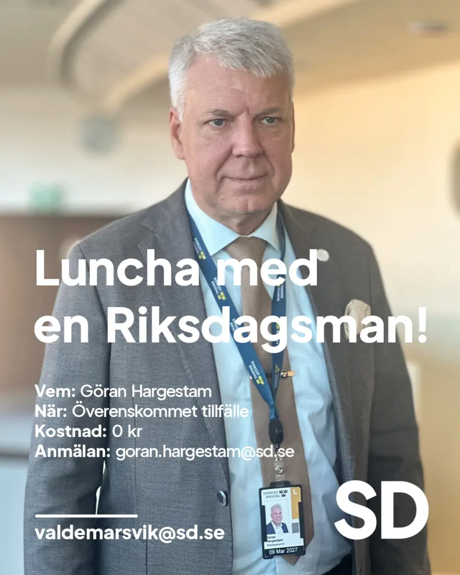 Nu har du som är – eller vill bli – medlem och aktiv i Sverigedemokraterna Valdemarsvik–Ydre chansen att luncha med Riksdagsledamoten Göran Hargestam vid ett överenskommet tillfälle.